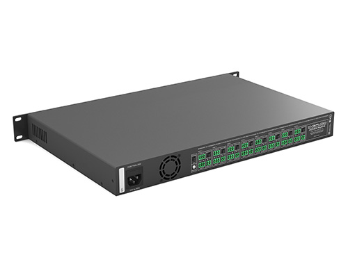 Для выполнения функции дистанционного питания предусмотрены восемь (8) выходов на разъемах Euroblock 2-pin с независимой настройкой подаваемого напряжения, переключатель 12 или 24В DC. Максимальный ток нагрузки у каждого выхода равен 1А, для всего прибора максимальный ток = 8А.