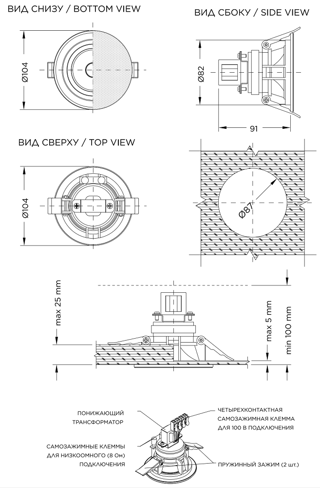 Монтаж данного громкоговорителя осуществляется в подвесной потолок из гипсокартона либо потолок типа «Армстронг», для чего необходимо подготовить монтажное отверстие Ø90 мм. Также учитывайте, что для корректного монтажа запотолочное пространство должно быть не менее 100 мм, а толщина потолка 5 - 30 мм. При выполнении всех требований, громкоговоритель легко фиксируется двумя пружинными зажимами, при этом кабельная линия подводится к 4-х контактной клеммной колодке на тыльной стороне. Подключение кабеля к клеммам довольно простое и быстрое, кабельные жилы заводятся в пазы и фиксируются зажимными винтами.