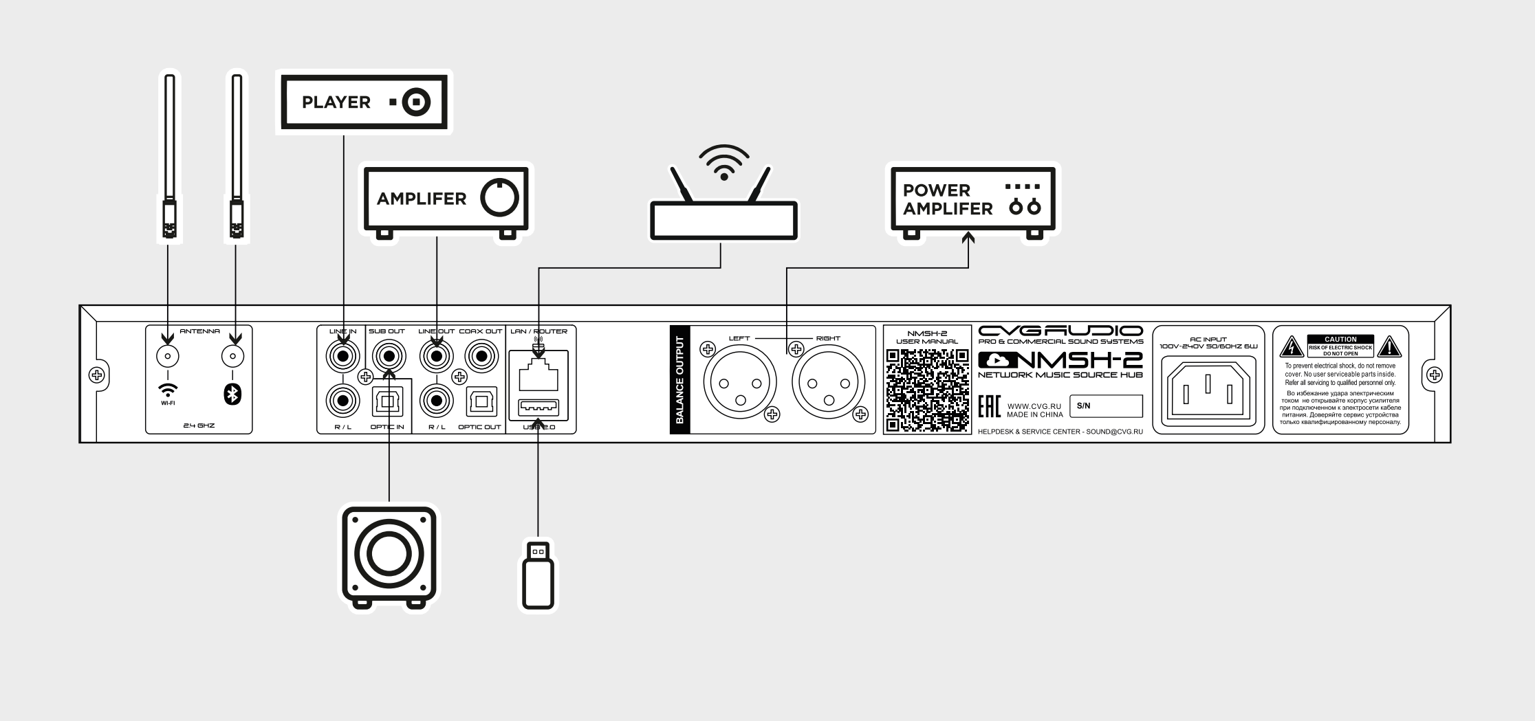 На тыльной части корпуса расположены коннекторы. Линейный небалансный аудиовход, разъемы 2х RCA, для подключения внешнего источника с целью синхронизации вещания через плеер. Аудиовыходы: линейные, балансные, разъемы 2х XLR; линейные, небалансные 2х RCA; суммарный выход на активный сабвуфер (SUB OUT), разъем RCA; цифровой коаксиальный выход (COAX OUT), разъем RCA. Оптические вход (для цифрового источника сигнала) и выход.
