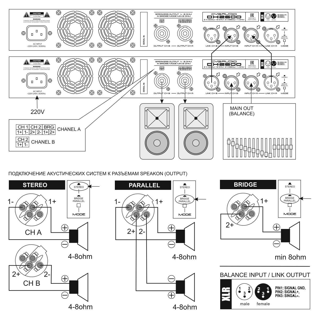 | Поддерживаемый режим работы | 4-8 Ом; STEREO, PARALLEL, BRIDGE |