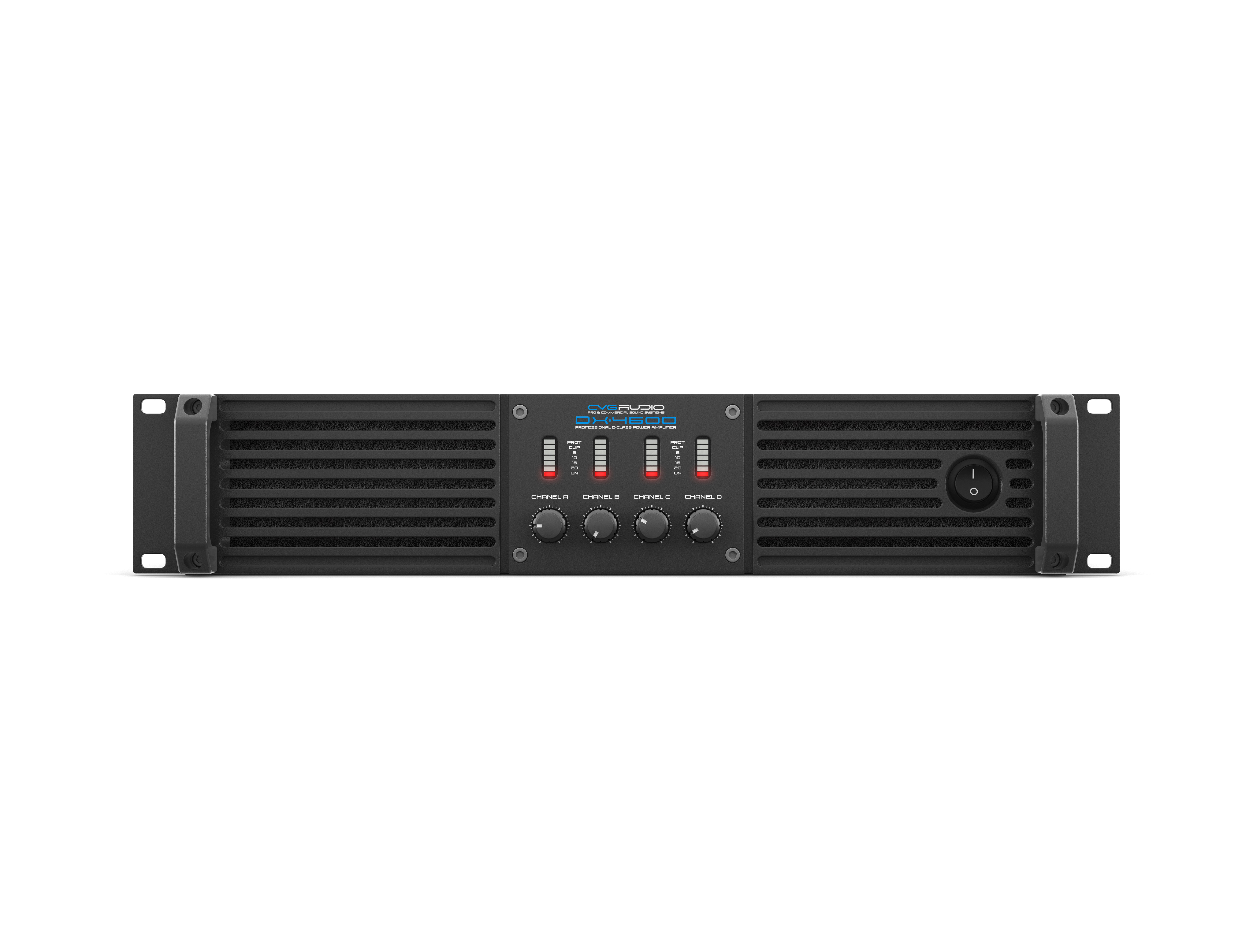CVGAUDIO DX-4600 – это профессиональный четырехканальный усилитель мощности класса D для совместной работы с низкоомными акустическими системами (4-8 Ом для каждого канала), мощностью 4 х 600 Вт при 8 Ом, 4 x 960 Вт при 4 Ом и 2х 1920 Вт при 8 Ом в мостовом режиме. Переключение режимов работы осуществляется с помощью селектора на задней панели устройства. На лицевой алюминиевой панели имеется кнопка питания и четыре регулятора громкости на каждый канал (также предусмотрена LED-подсветка индикаторов уровня для каждого канала, перемодуляции и аварийного отключения). Охлаждение выходного каскада усилителя осуществляется за счёт вентиляционной системы с автоматической переменной скоростью вращения.